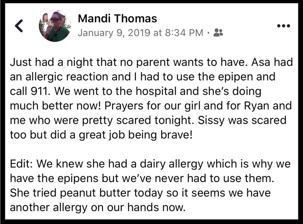 This past weekend, Asa took her first ambulance ride. She also received her first epipen in over 3 years…