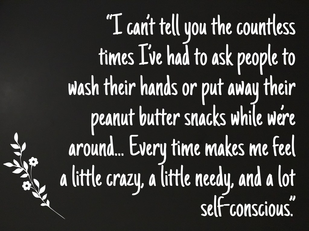 I can’t tell you the number of awkward moments I’ve had. The countless times I’ve had to ask people to wash their hands. The times I’ve had to remind my friends that their kids’ bottle filled with milk couldn’t be left out for fear my daughter would grab it and take a drink. The times I’ve had to remind the Sunday School workers again for the 10th Sunday in a row that my daughter has allergies and can only have the snack we packed for her. The times we’ve had to give the epipen tutorial. The times I’ve had to ask that my friends put away the peanut butter snacks while we are around. The times we’ve had to wipe down tables/high chairs when we get to a restaurant while other people look at us and think we are just massive germaphobes. All of these times are really hard. Every time makes me feel a little crazy, a little needy, and a lot self-conscious.